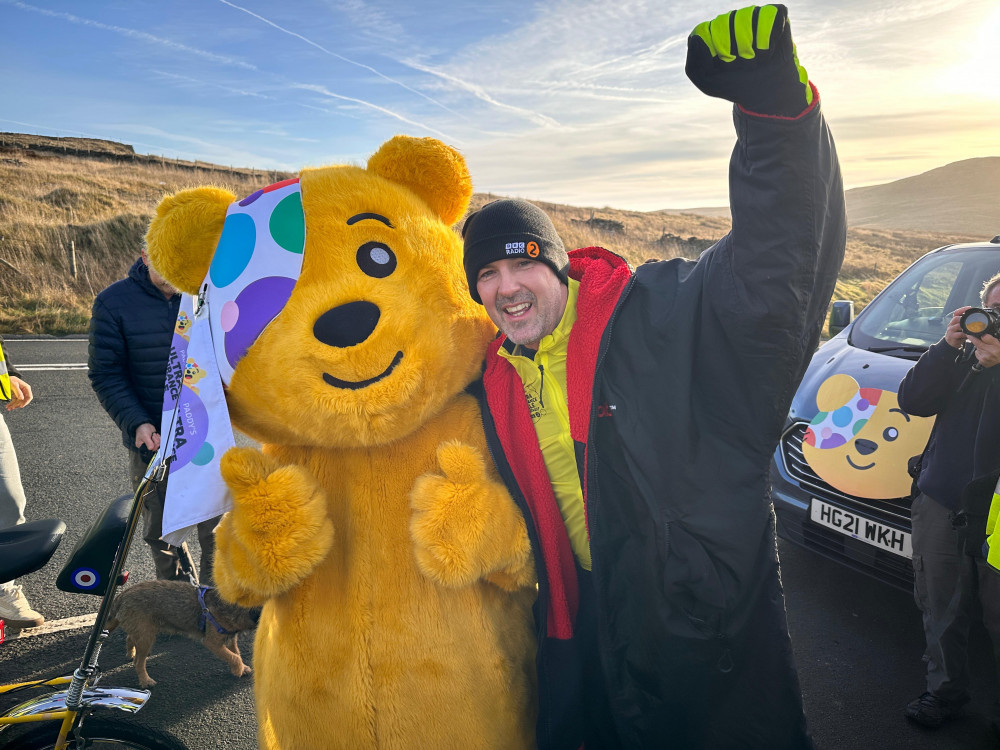 Highlights today included being set on his way by the Mayor of Kendal, Councillor Jonathan Cornthwaite; hearing from his friend, Vicky McClure, during The Zoe Ball Breakfast Show; being met en route by some of his former secondary school friends, one of whom also worked with him at one of his first ever jobs in 1989 - a Saturday job cleaning at the Warburtons factory – and they surprised him near the top of the brutal Shap Summit with a donation of £50 000 from the bakery; gladiator Giant surprised Paddy this morning and cycled some of the way alongside him; Paddy’s good friend Melvyn Downes from SAS Who Dares Wins surprised him a bit later on by camouflaging himself under a pile of leaves and jumping out when Paddy stopped for a short break; during Scott Mills’ show, Blue serenaded Paddy from the studio with a version of their debut single All Ride specially reworded in honour of Paddy’s challenge. And Sara Cox revealed to Paddy that Sir Tom Hunter’s Hunter Foundation has been so inspired by his heroic cycling efforts for this Radio 2 challenge for BBC Children in Need that he’s going to double every single amount of money that has been donated so far today and for the rest of Paddy’s challenge, right up to £2 million!